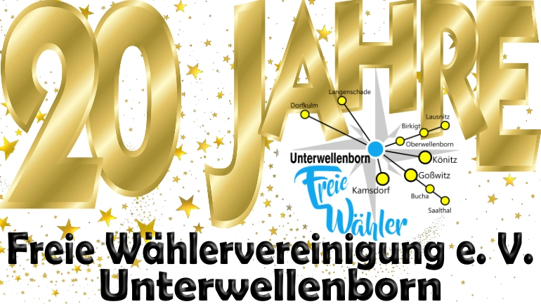 Am 17. Januar 2026 begeht die Freie Wählervereinigung e. V. Unterwellenborn ihr 20-jähriges Jubiläum. Die Gründung erfolgte am 17. Januar 2006 in der Gaststätte „Zur Güldenen Gabel“ in Bucha durch 29 engagierte Bürgerinnen und Bürger aus den meisten Ortsteilen der heutigen Gemeinde Unterwellenborn. Seit dem 1. Februar 2006 besteht die Einheitsgemeinde Unterwellenborn mit ihren 11 Ortschaften.